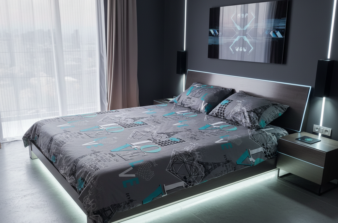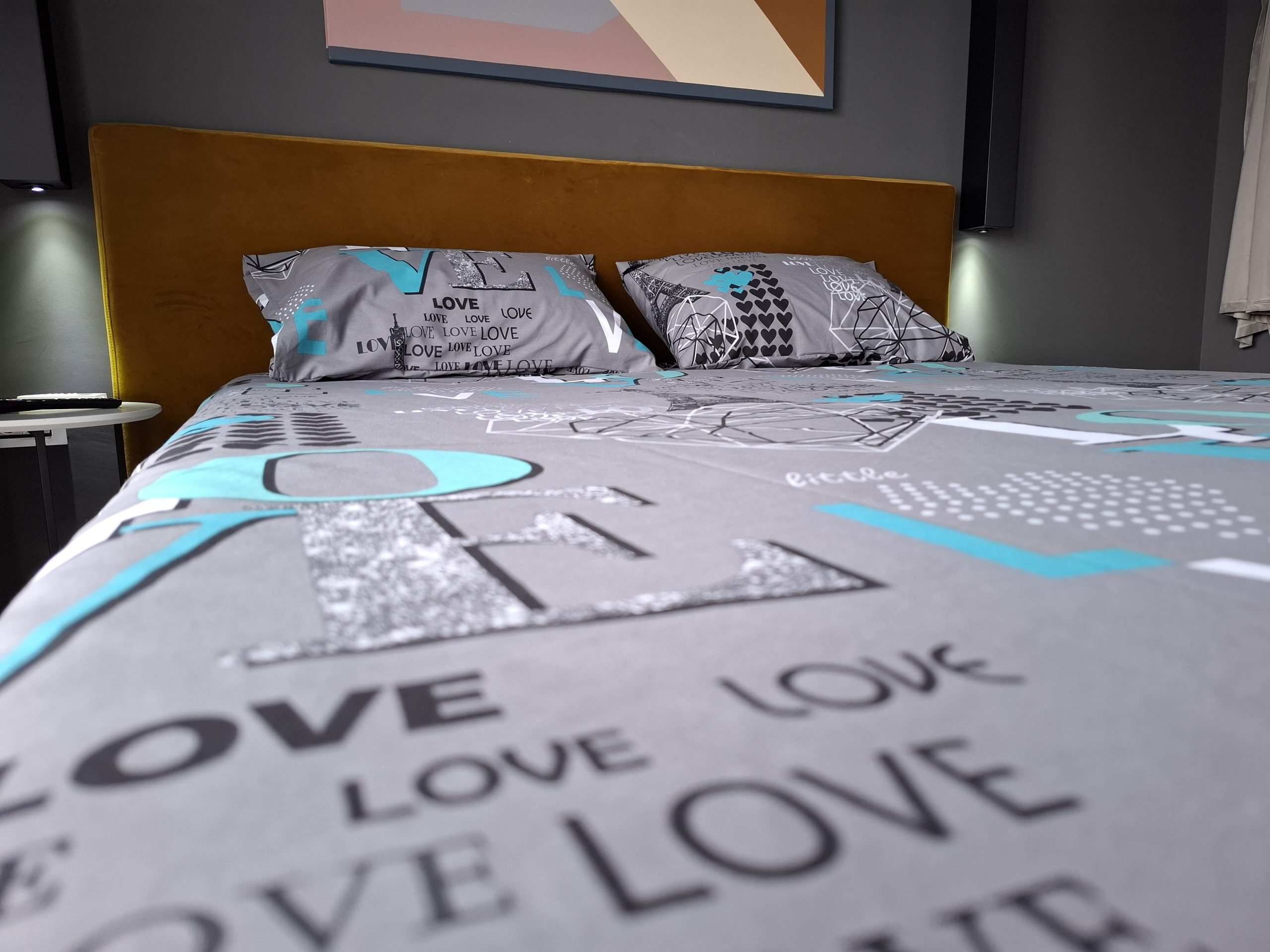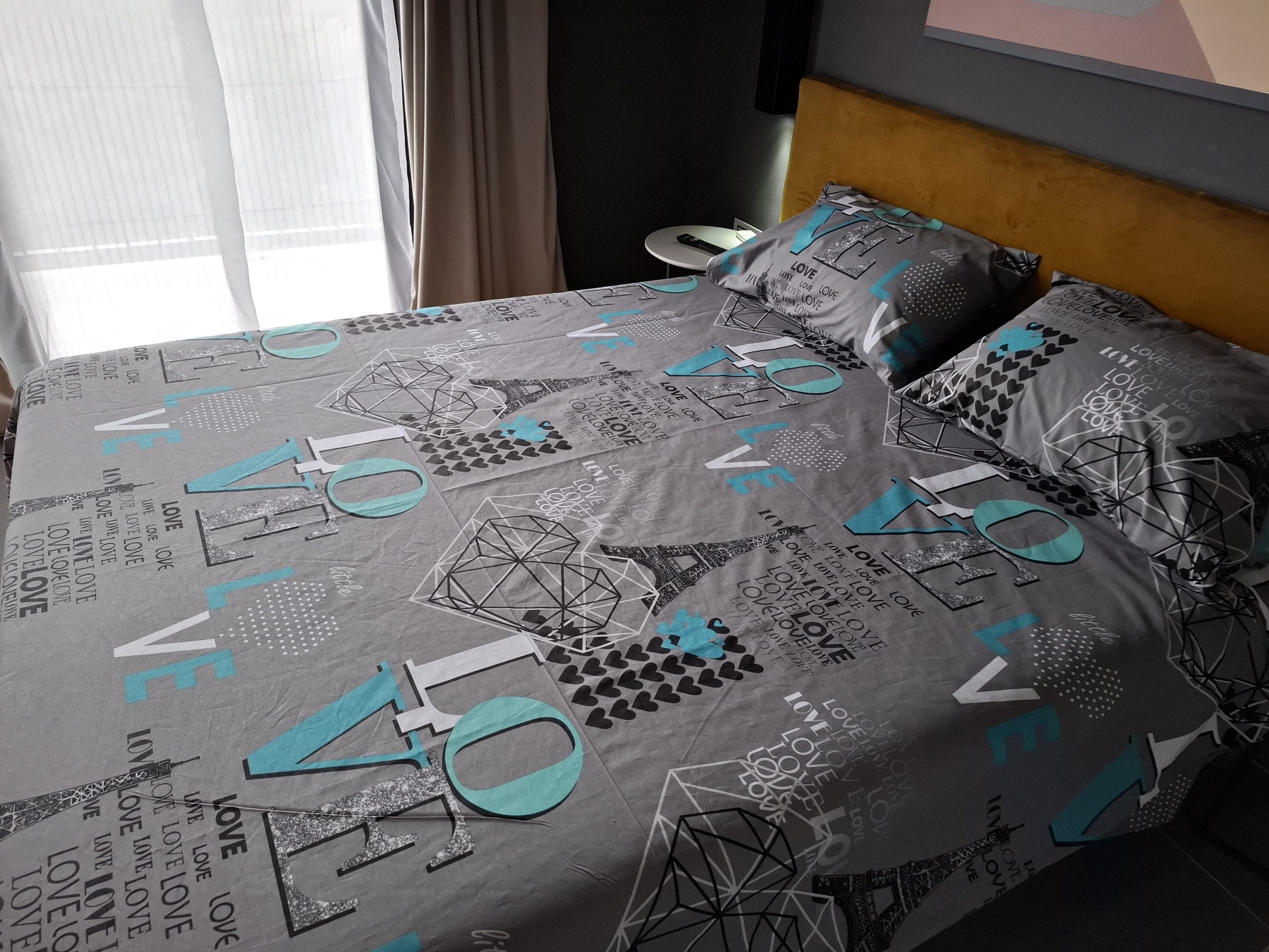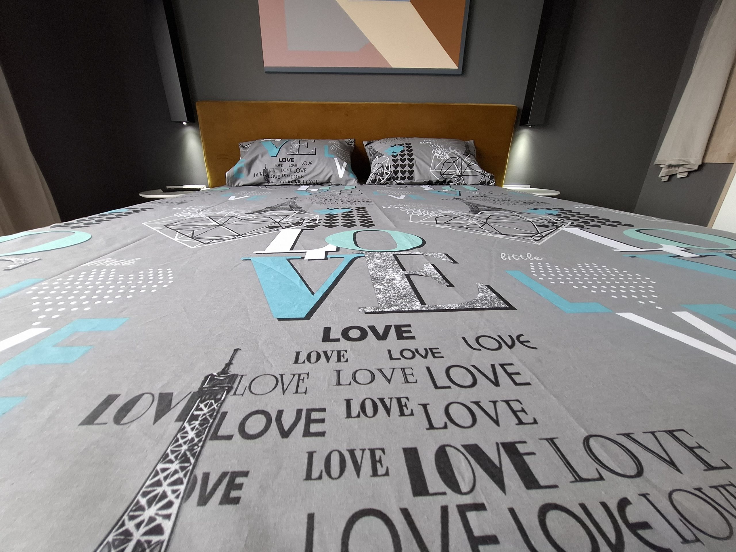 U nežnim sivim tonovima sa plavim detaljima, ispisom LOVE i motivom Ajfelovog tornja, unosi dašak Pariza pravo u vašu spavaću sobu. 🗼💫