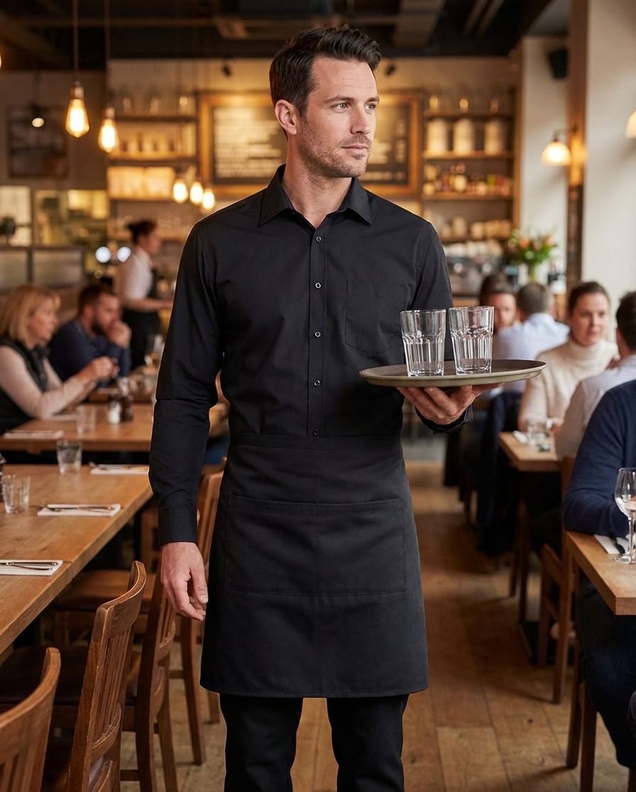 Konobarska kecelja sa dva prednja džepa i trakom za vezivanje oko struka.